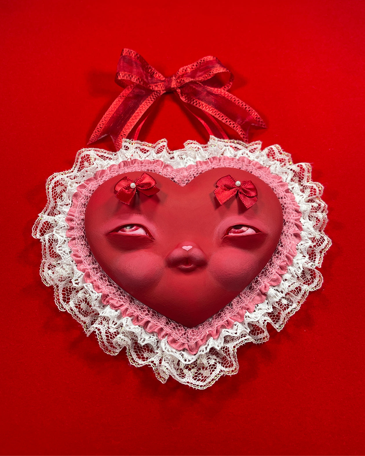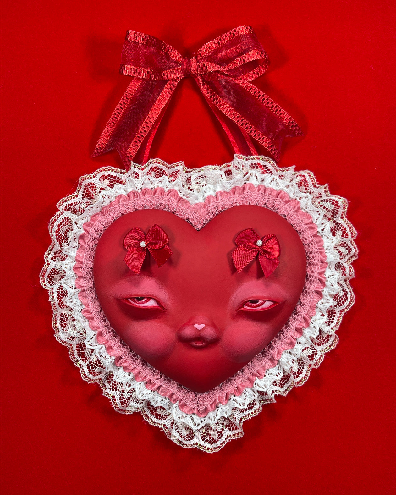 These cheeky candy heart shaped bunny face hangs nicely in the wall. Their bow acts as a decorative hook. Sculpted by hand first then casted individually, colors may appear slightly darker or lighter than photograph.