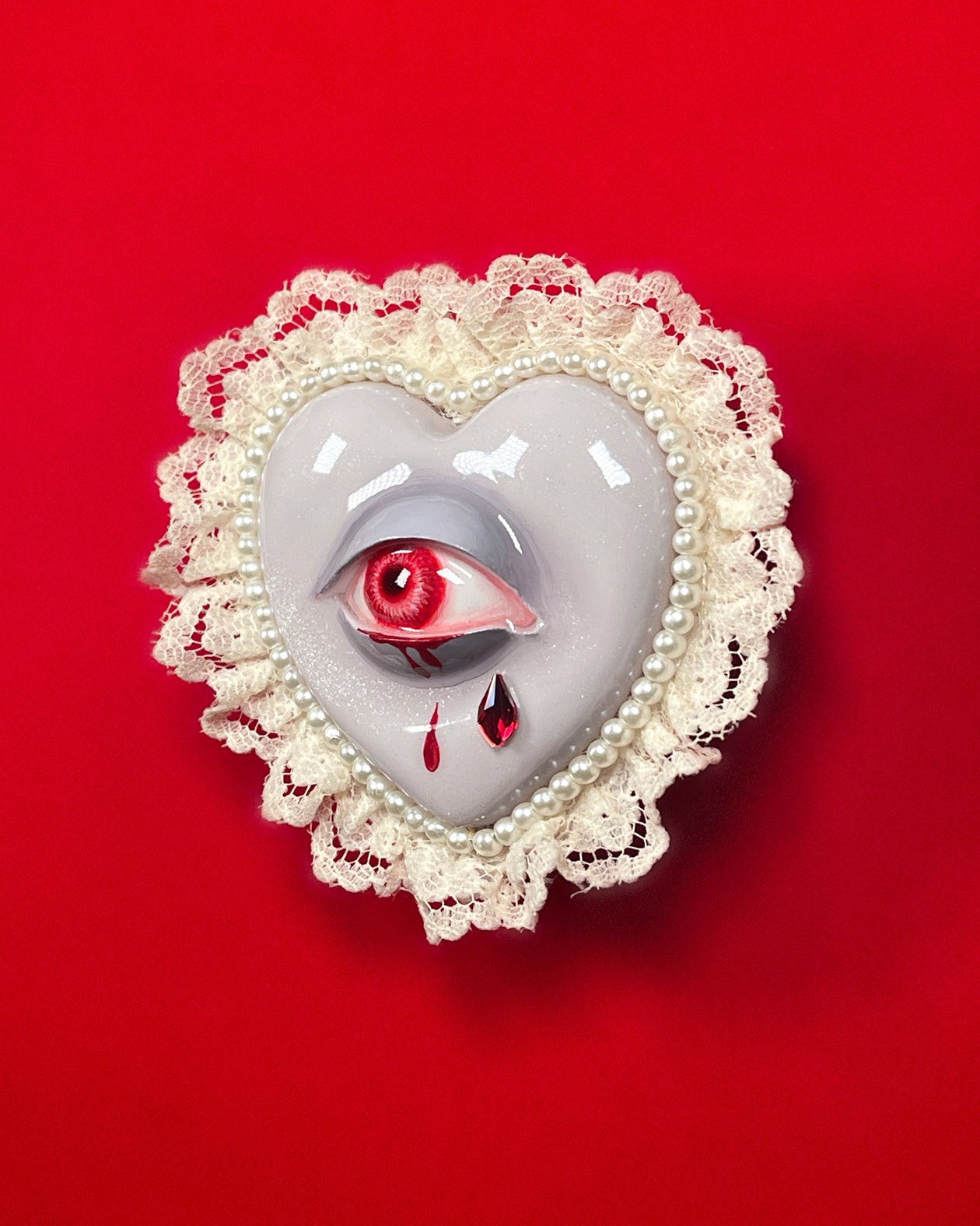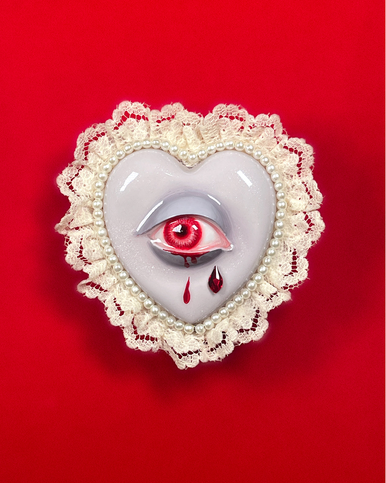 Lovers Eye brooches are Individually hand painted and casted in resin by artist Miso. Painted lace with some stiffness to the trim, no two brooches are the same. These wearable brooches measures roughly: 3.2”x 3.2" inch  /  8cm x 8cm