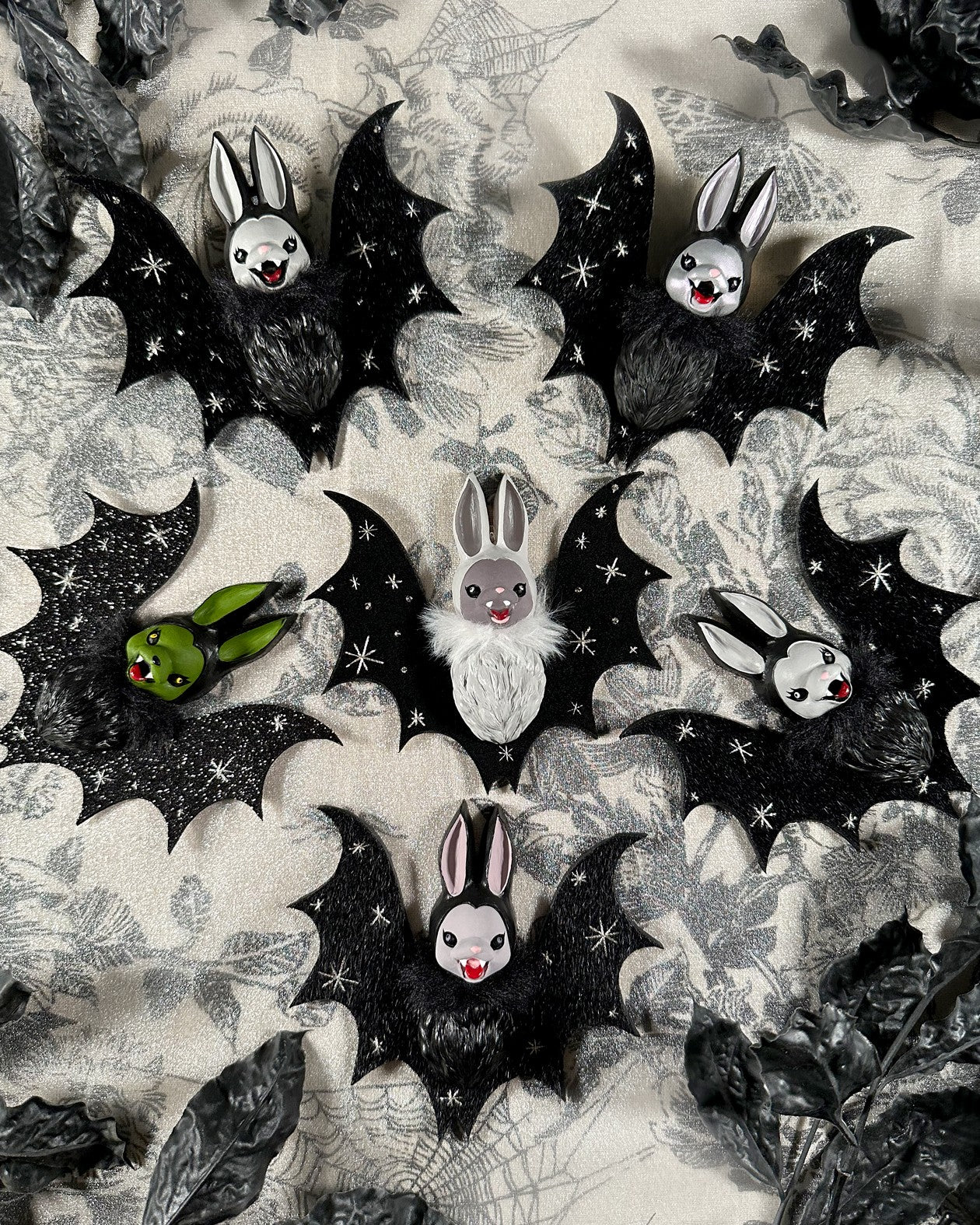 Vampire Bunnies are individually hand casted and painted. The wings are cut and embroidered by artist Miso. They come ready to hang with a ribbon and bow attached. The colors may appear darker or lighter in the photograph. No two piece is the same.